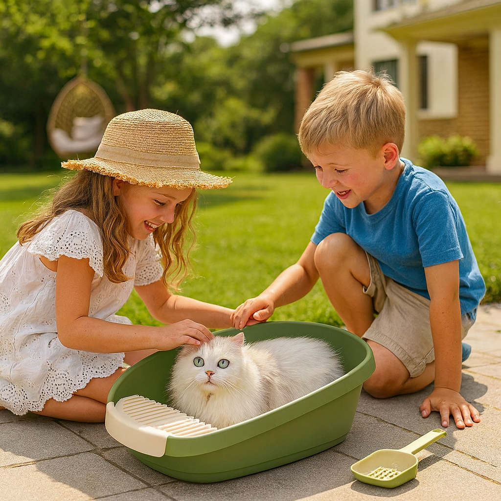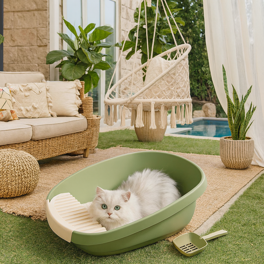 Arenero práctico y profundo, diseñado para brindar comodidad y espacio suficiente a las mascotas, especialmente a los gatos.